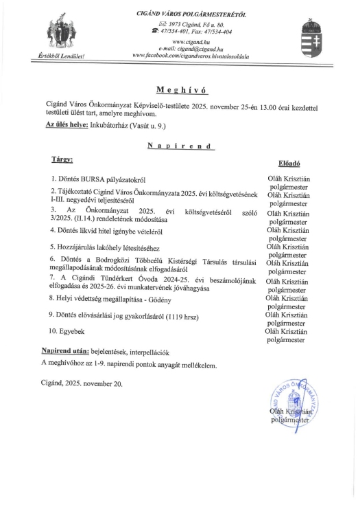 | Meghívó Képviselő-testületi ülésre! | 2025. november 25. |