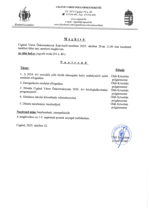 | Meghívó Képviselő-testületi ülésre! | 2025. október 28. |